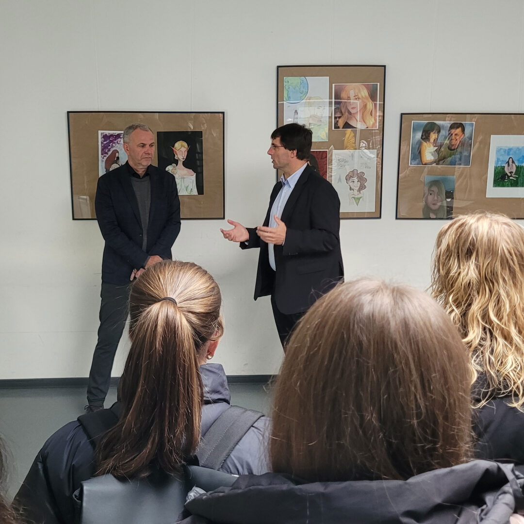 „Wie hat man denn die Unterdrückung in der DDR genau gespürt?“ Diese und andere Fragen von Schülerinnen und Schülern waren in der vergangenen Woche Thema in einer Unterrichtsstunde der besonderen Art. Zwei Klassen des beruflichen Gymnasiums für Gesundheit und Soziales am Rhein-Maas Berufskolleg hatten im Rahmen ihres Gesellschaftslehreunterrichts die Gelegenheit, Politik unmittelbar zu erleben. Die Ausstellung eröffnete nämlich Dr. Markus Optendrenk, gewählter Landtagsabgeordneter des Kreises Viersen und Finanzminister des Landes NRW, der im Anschluss in einer angeregten Diskussion auf Fragen der Schülerinnen und Schüler antwortete. Die Ausstellung zeigt den Umgang mit der Geschichte der SED-Diktatur und der staatlichen Teilung seit dem Ende der DDR. Insgesamt 20 Tafeln informieren dabei über die wesentlichen Elemente des Lebens und Handelns im ehemaligen zweiten deutschen Staat. Von der „Stasi“ über die Konsumläden bis hin zur Wende wird umfassend in Bild- und Textelementen informiert. Die Ausstellung unter der Federführung der „Bundesstiftung zur Aufarbeitung der SED-Diktatur“ ist speziell zum Erinnerungsjahr 2024, in dem die doppelte deutsche Staatsgründung 75 und die Friedliche Revolution 35 Jahre zurückliegen, konzipiert worden. Uwe Lagac, kommissarischer Schulleiter des Rhein-Maas Berufskollegs, ist begeistert: „Die Ausstellung ist überaus wichtig, weil dort eine bedeutende Phase der deutschen Geschichte dargestellt wird, die in Gefahr ist, vergessen zu werden. Und einen Politiker zu gewinnen, der mit den Schülerinnen und Schülern unbefangen diskutiert, ist für das Erlernen von Demokratie herausragend.“