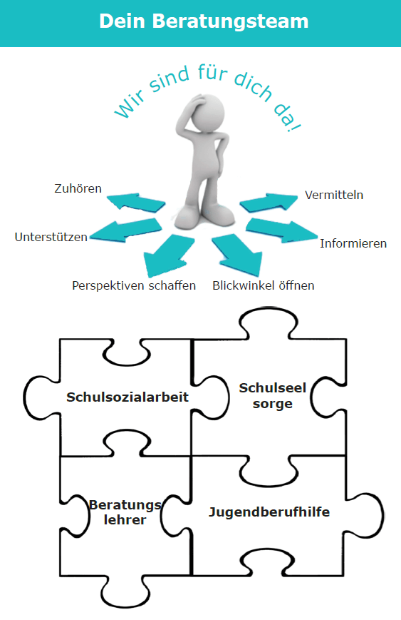 Als Beratungsteam stehen wir euch hier gerne zur Verfügung und zur Seite, können euch unterstützen und begleiten. Diese Hilfe beschränkt sich nicht nur auf schulische Belange, sondern gilt für alle Lebensbereiche. Ihr entscheidet freiwillig, ob ihr unsere Unterstützung annehmen wollt. Die Inhalte der Gespräche unterliegen der Verschwiegenheit und die Gespräche finden in einem angemessenen, vertraulichen Rahmen statt.