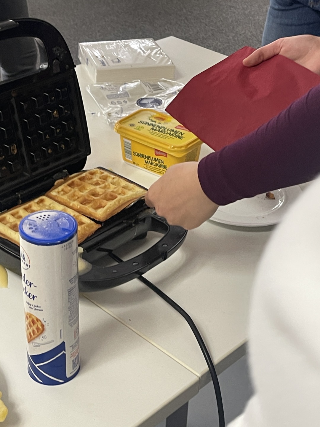 Am Standort Nettetal des Rhein-Maas Berufskollegs gab es am 30. Oktober 2023 in den Pausen frische Waffeln. Vorher wurde die Aktion im Fach Projektmanagement besprochen und geplant.